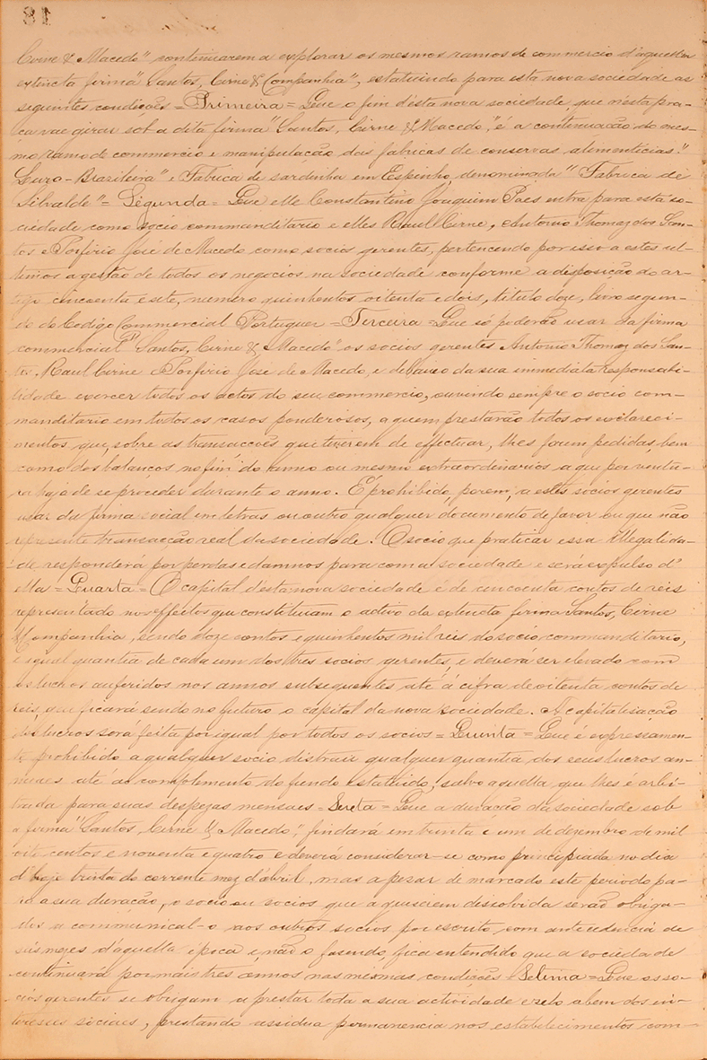 Primeira: Que o fim desta nova sociedade, que nesta praça vai girar sona a dita firma « Santos, Cirne & Macedo » é a continuação do mesmo ramo de commércio e manipulação das fabricas de conservas alimentícias “Luso- Brazileira” e Fabrica de sardinha em Espinho, denominada “Fabrica de Silvalde”.