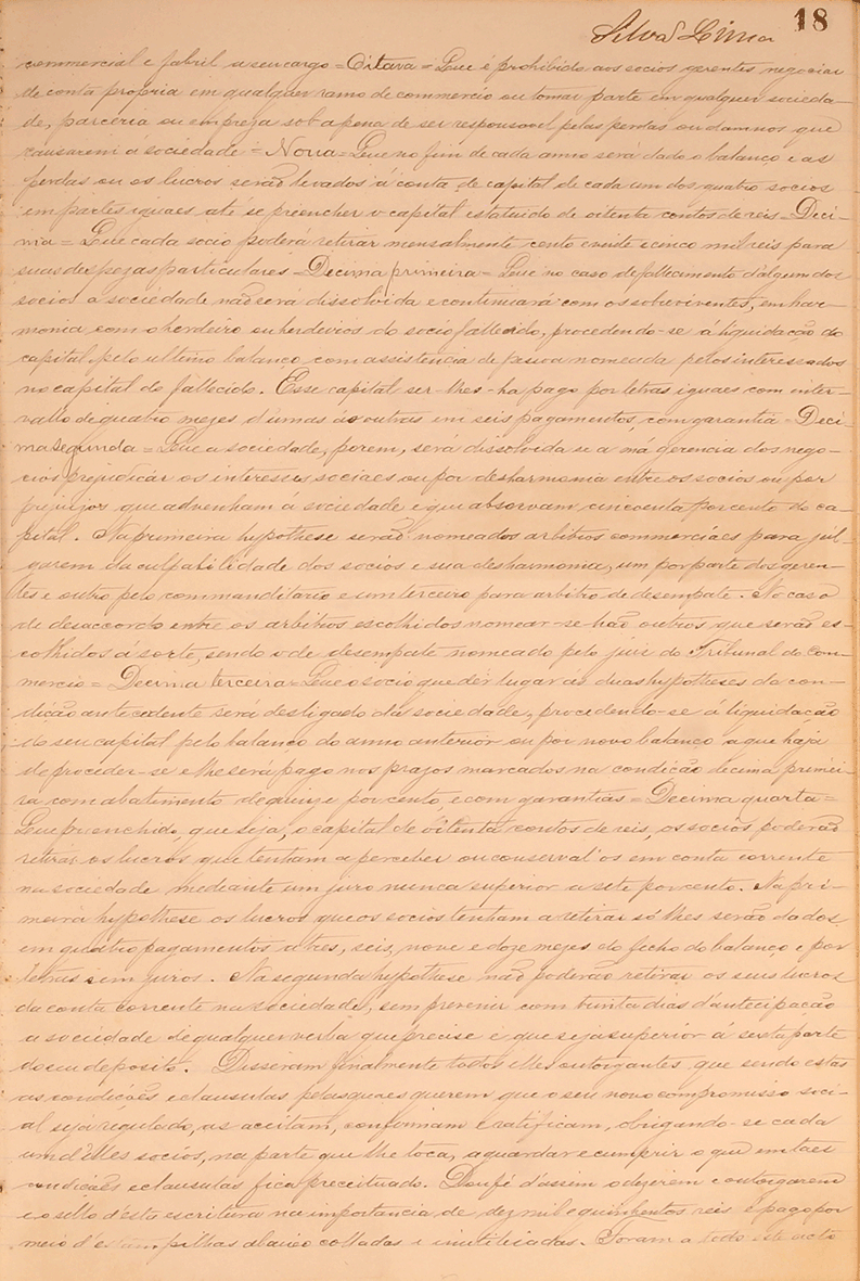 Decima segunda: Que a sociedade, porem, será dissolvida se a má gerência dos negócios prejudicar os interesses sociaes ou por desarmonia entre sócios ou por prejuízos que advenham á sociedade e que absorvam cincoenta por cento do capital. Na primeira hipothese serão nomeados arbitors commerciaes para julgarem da culpabilidade dos sócios e sua desarmonia, um por parte dos gerentes e outro pelo comanditário e um terceiro para arbitro de desempate. No caso de desacordo entre os arbitro escolhidos nomerar-se-hão outros que serão escolhidos à sorte, sendo o de desempate nomeado pelo juiz do Tribunal do Comercio.