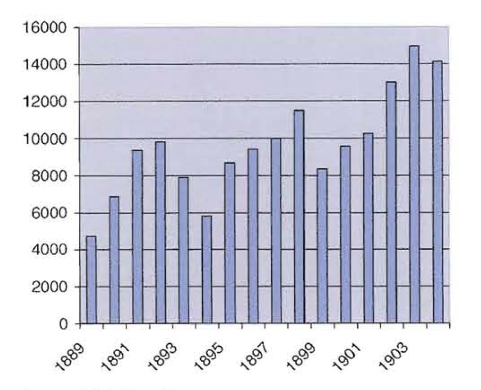 The situation post-entry may even be described as a non-cooperative duopoly made of the previously established firms and the newcomers, as all of them were profit maximisers (Dixit, 1980). Although total industrial production is unknown, exports may be used as a proxy to account for the short-run production fluctuations. As expected, and although the long-run trend was increasing from 1889 to 1903, strong annual fluctuations occurred, between 5000 and 15,000 tons, as Figure 2 shows. (Of course the fluctuations of the monetary value of these exports were smoother than the fluctuations of the exported quantity, because of compensatory variations of prices in the world market and, in one way or another, canned fish exports were a relevant item in the Portuguese trade balance, almost tripling from 1889 to 1904.)18