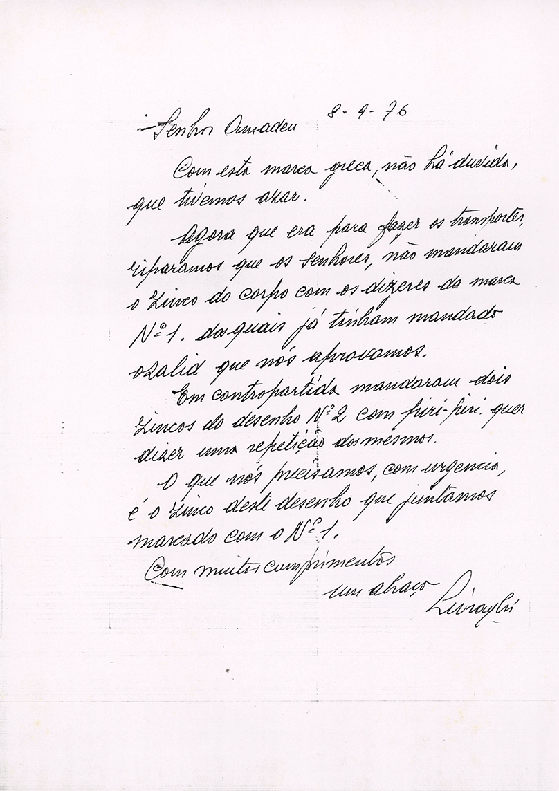 Documento de 1976, uma carta técnica relativa a zincos de impressão (chapas litográficas) para embalagens, onde se assinala um erro no envio do material gráfico e a urgência em corrigir.