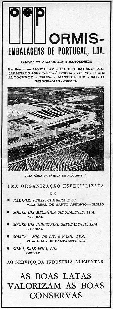 Década 50, século XX – ORMIS — Embalagens de Portugal, S.A.R.L. que teve fábricas em Alcochete e Matosinhos, surgiu como uma “organização especializada” de vários fabricantes de latoaria e de conservas de Algarve, Setúbal e Lisboa