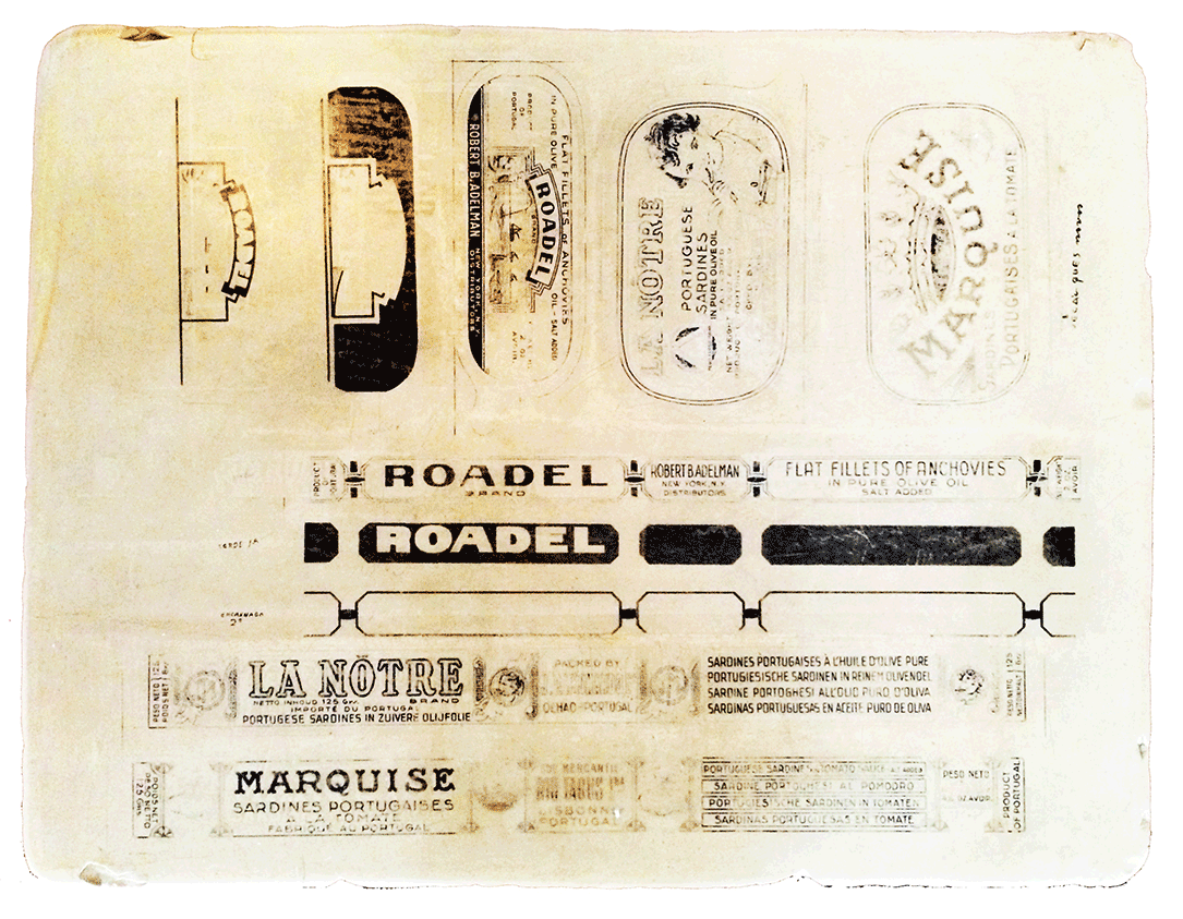 Pedra litográfica com embalagens de conservas das marcas Aldite, LT e Dante