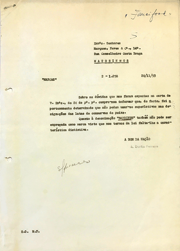 Sobre as dúvidas que nos foram expostas na carta de V. Ex.ªs, de 24 do p.º p.º, cumpre-nos informar que, de facto, foi oportunamente determinado que não podiam usar-se superlativos nas designações das latas de conservas de peixe.