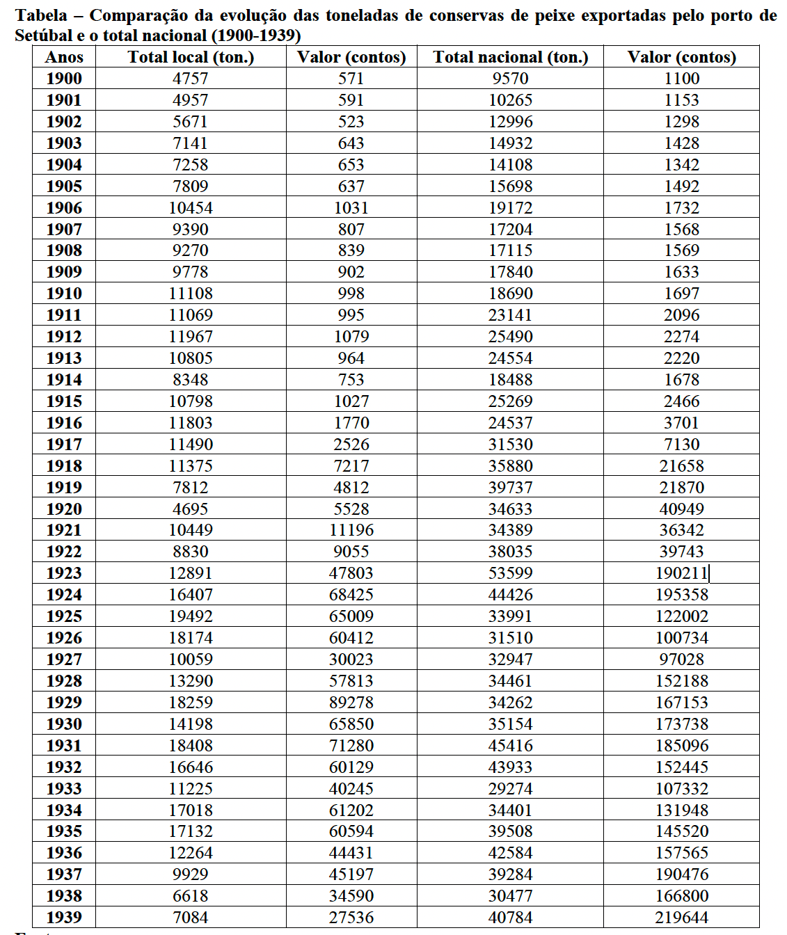 Nota: Em 1939, por terra, foram exportadas de Setúbal 1.720 toneladas através de 99.825 caixas de conservas de peixe.